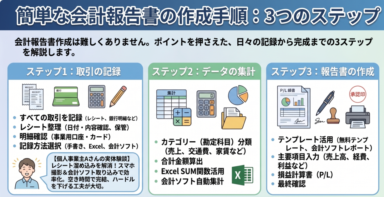 会計報告書と聞くと難しく感じるかもしれませんが、ポイントを押さえれば誰でも簡単に作成できます。ここでは、日々の記録から報告書完成までの3つのステップを具体的に解説します。