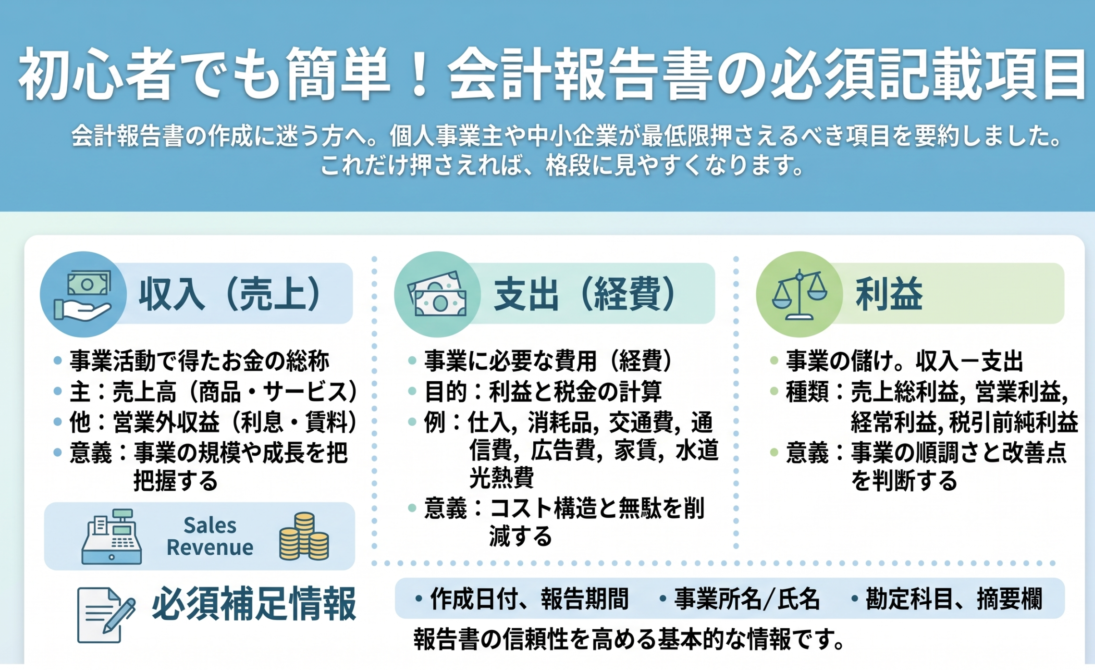 会計報告書を作成する上で、「何を書けばいいの?」と迷う方も多いでしょう。ここでは、個人事業主や中小企業が最低限押さえておくべき必須項目を、初心者の方にも分かりやすく解説します。これだけ押さえれば、あなたの会計報告書は格段に見やすくなります。