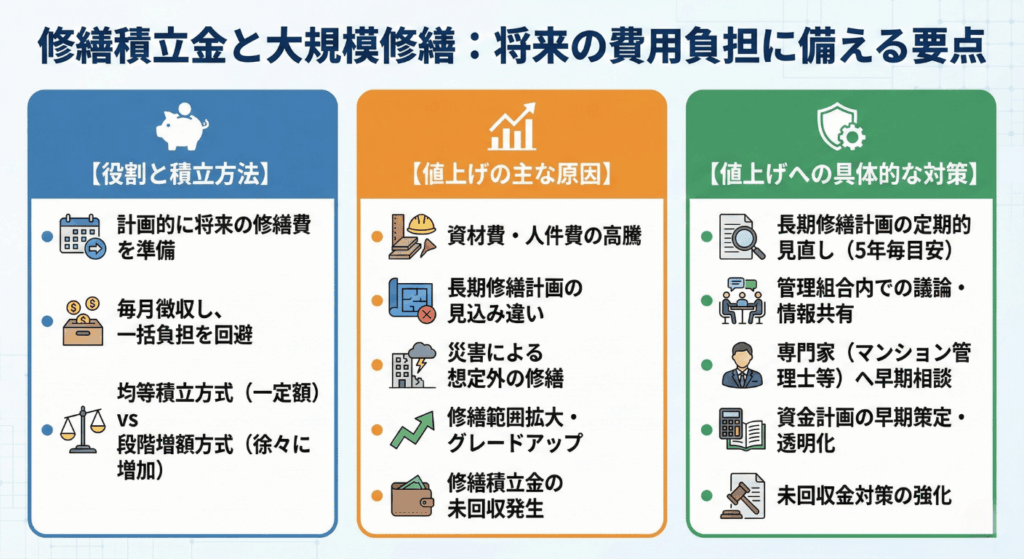 マンションの資産価値を維持し、快適な住環境を保つ上で不可欠な大規模修繕。この高額な費用を計画的に準備するために重要なのが「修繕積立金」です。ここでは、修繕積立金の役割から、多くのマンションが直面する値上げの背景、そしてそれに対する具体的な対策までを詳しく解説します。