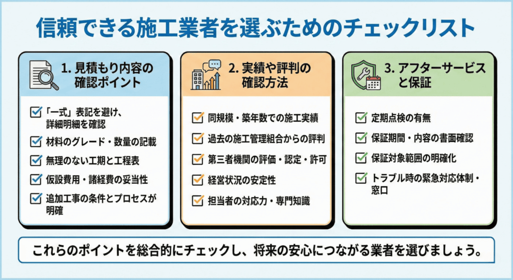 大規模修繕の成功は、適切な施工業者を選ぶかどうかに大きく左右されます。高額な費用を投じるからこそ、信頼できる業者を見極めることが非常に重要です。ここでは、業者選びで失敗しないための具体的なチェックポイントをご紹介します。